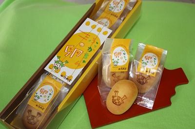 ふっかちゃんの卵 愛たまごたっぷりの黄味あんをミルク入りのやわらかな生地で包み焼き上げました。ふっかちゃんの焼き印がかわいい。